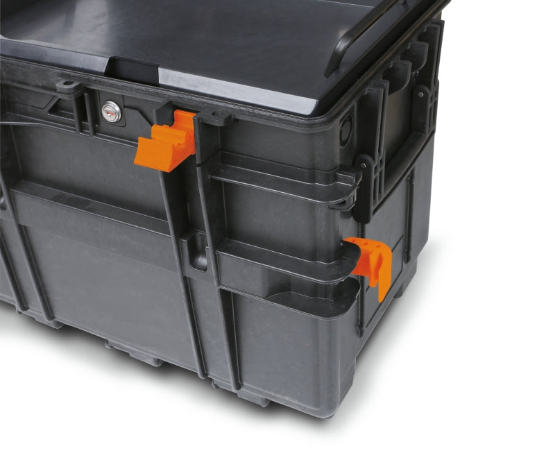 Front centralised lock allows top and front lids to be closed simultaneously.